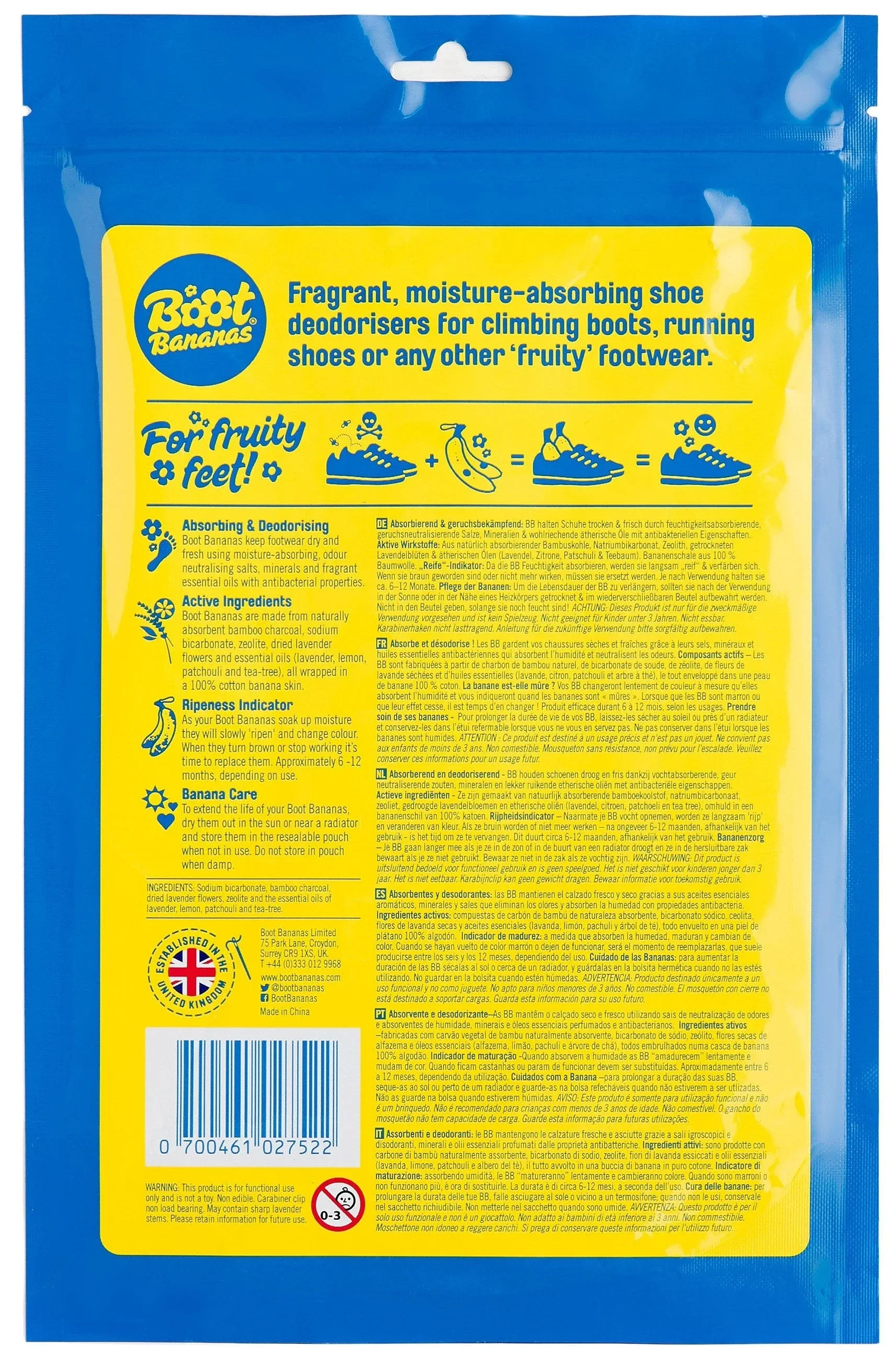 Stop aux chaussures malodorantes ! Les Boot Bananas sont des désodorisants parfumés pour chaussures , ils absorbent l'humidité des chaussons d'escalade, des chaussures de course... Les Boot Bananas sont fabriquées à partir de sels naturellement absorbants, de minéraux et d'extraits de plantes aux huiles essentielles de lavande, de citron, de patchouli et d'arbre à thé, le tout enveloppé dans une peau de banane 100 % coton. Inclus dans l'emballage : une paire de Boot Bananas liée par un mini mousqueton.